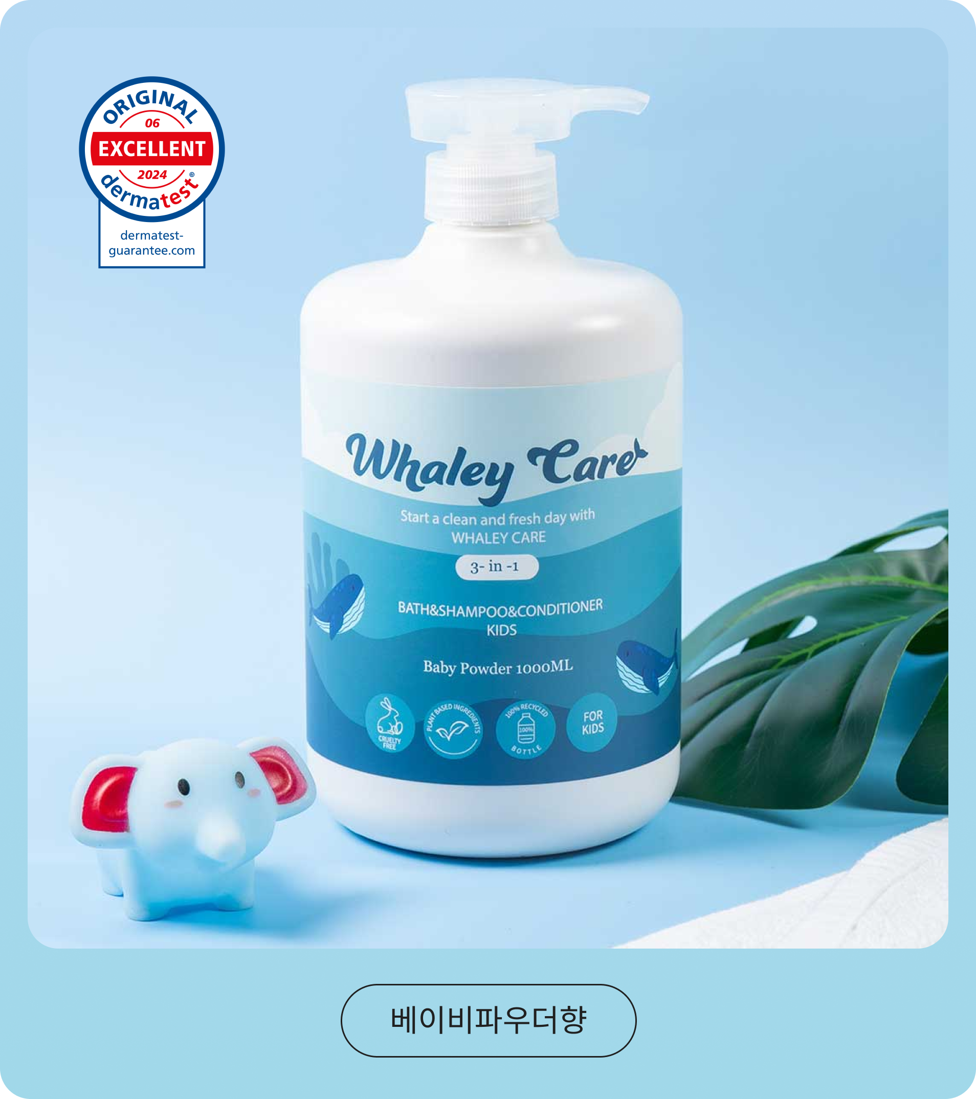 웨일리케어(Whaley Care)는 '고래처럼 큰 사랑으로 키우다'는 철학 아래 시작된 브랜드입니다.
